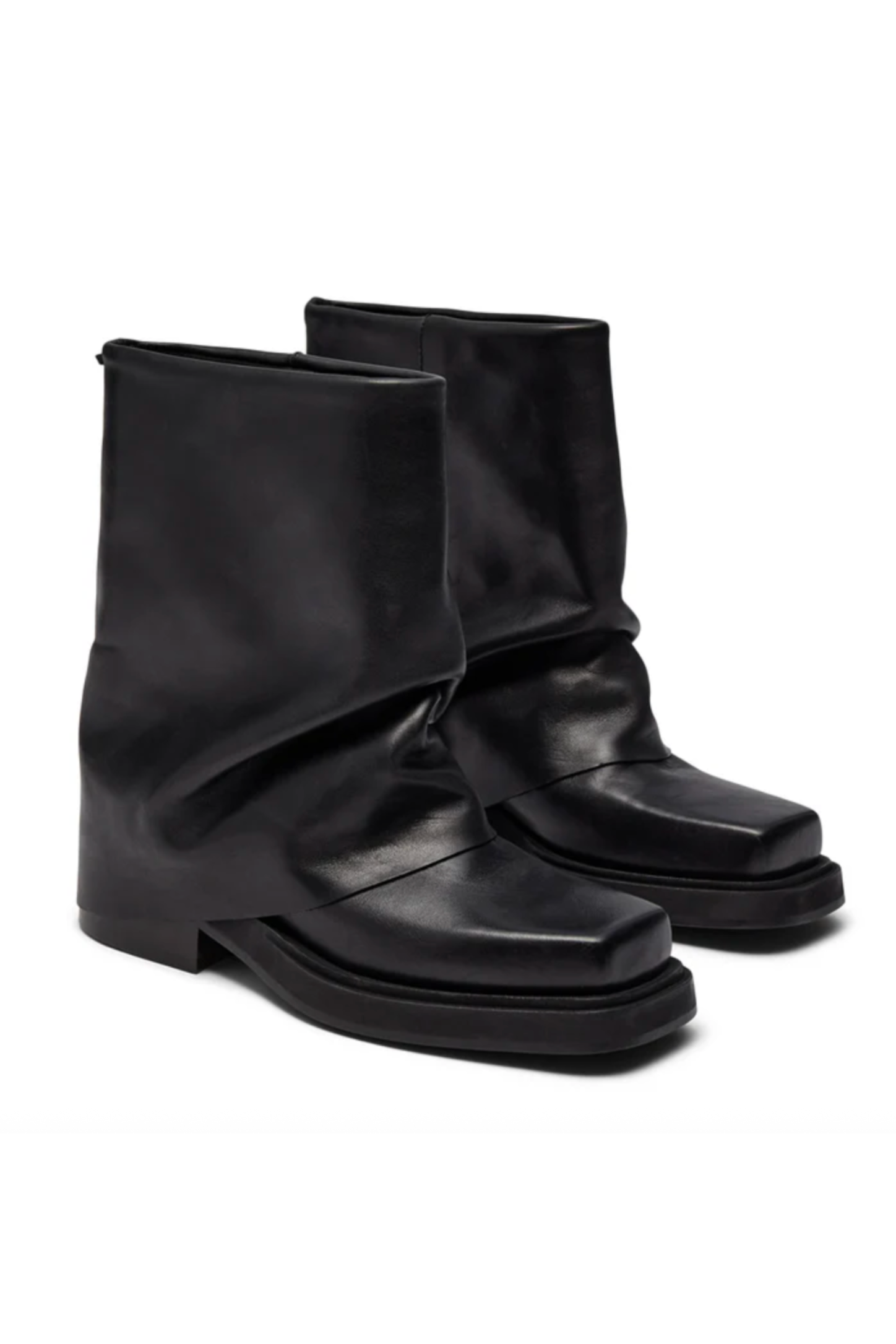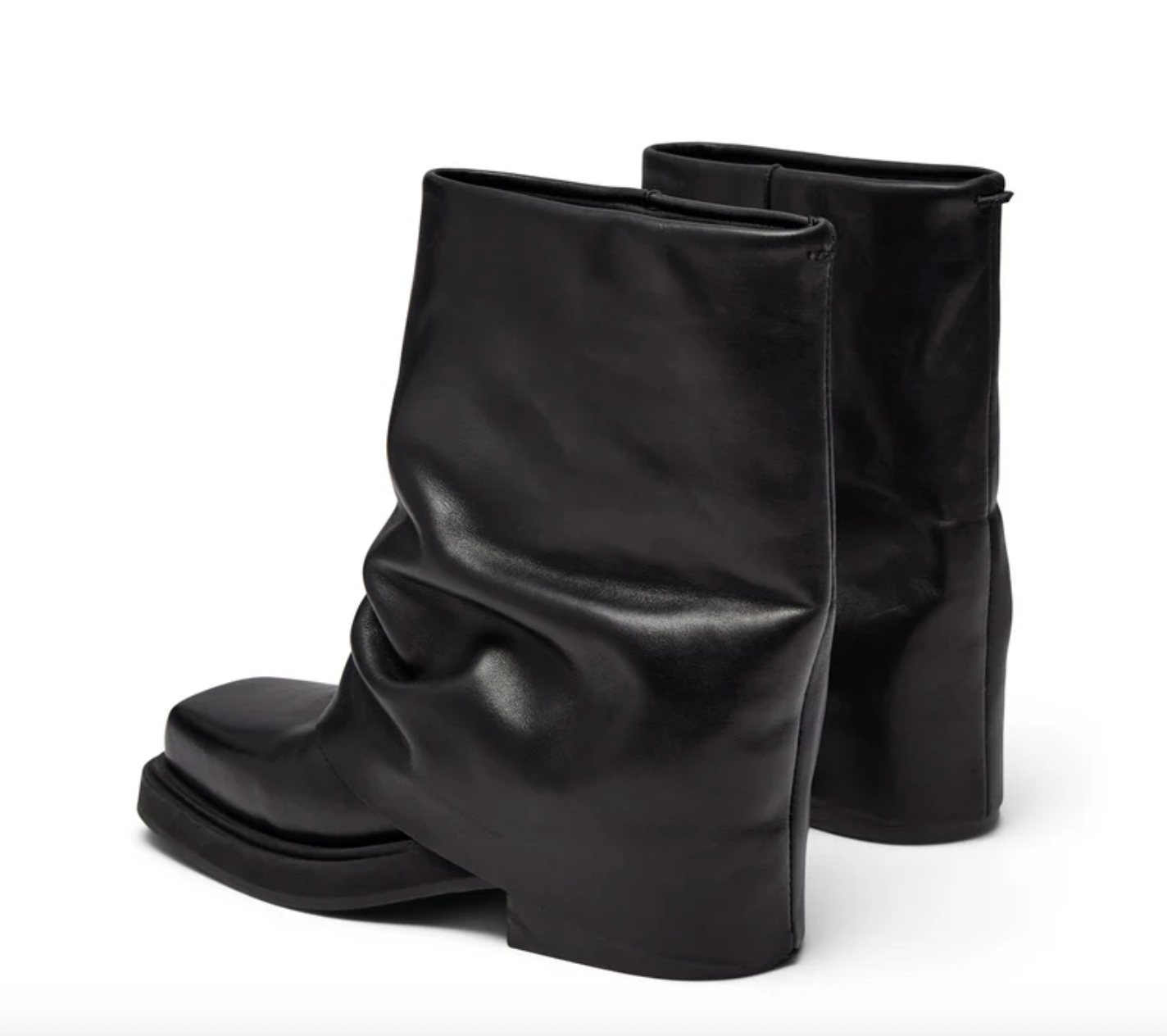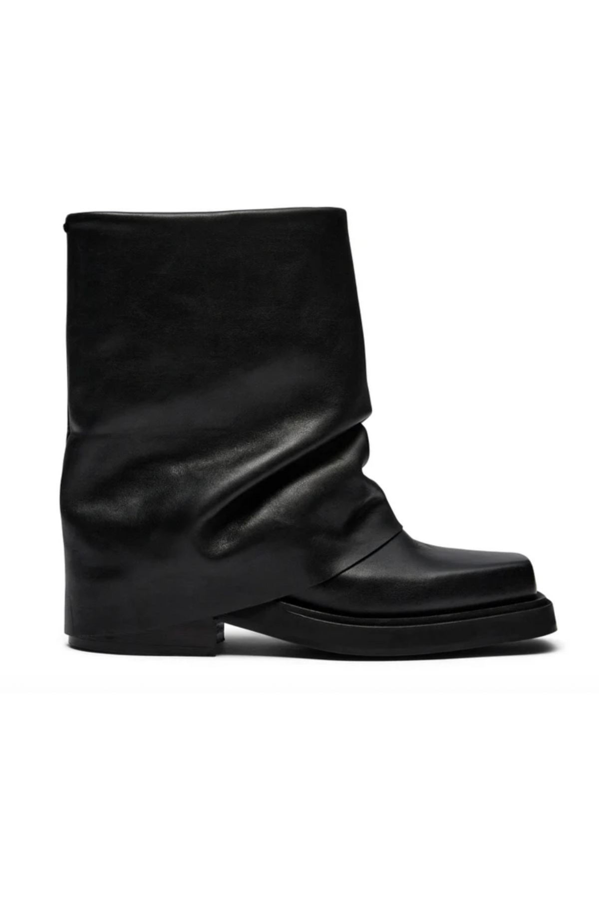 Edona-støvlen fra Pavement kombinerer det lave skaft med en flad, tyk sål. Den sorte læderfinish og det foldede design gør støvlen velegnet til både kjoler og bukser ved uformelle fester.