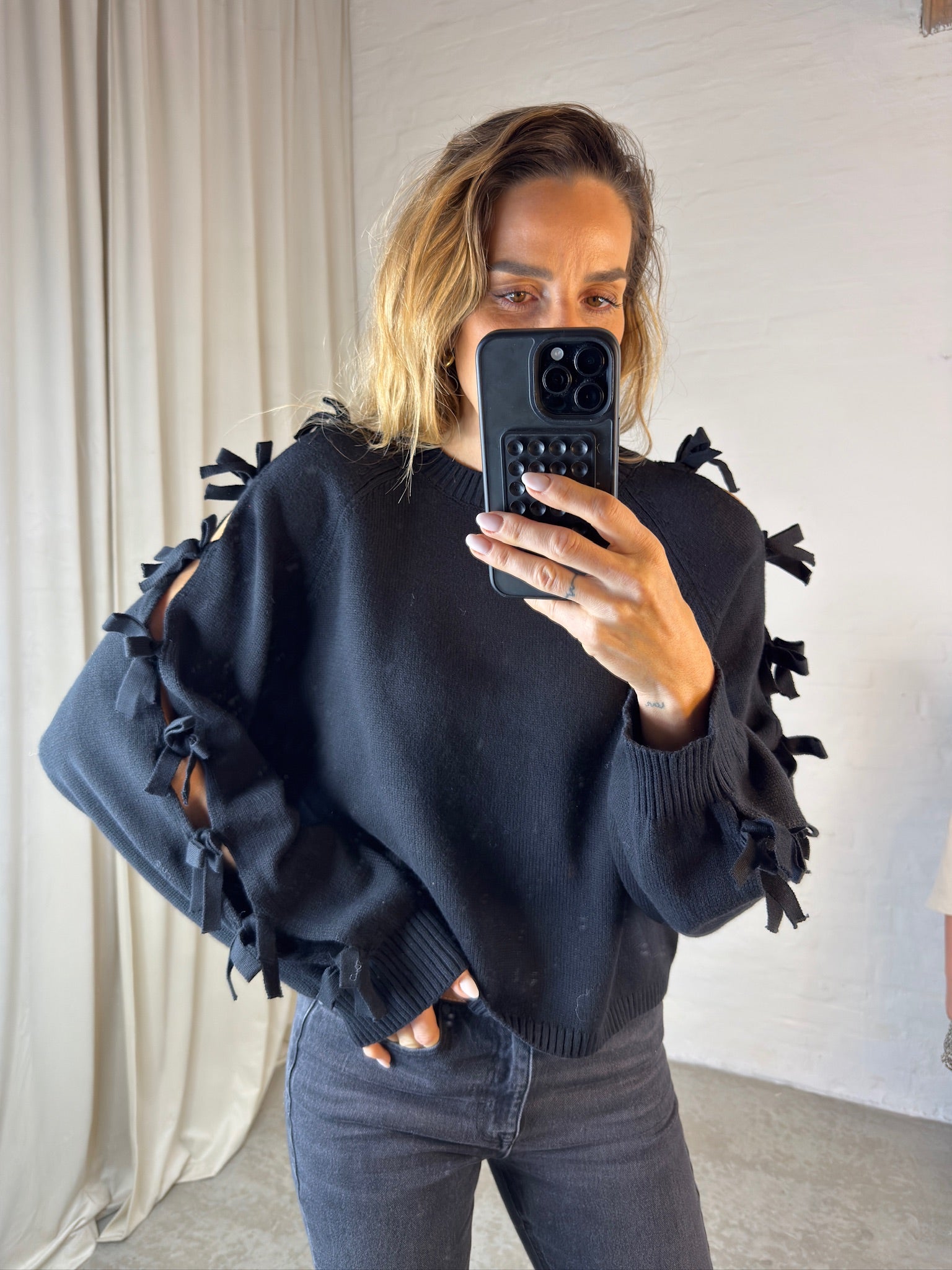 Permeli sløjfestrik fra Sofie Schnoor er en elegant og moderne strik med et feminint twist. Modellen har et regular fit, der giver et afslappet, men stilrent udtryk. De karakteristiske slidser langs ærmerne er dekoreret med fine sløjfer hele vejen ned, som tilfører designet et eksklusivt og legende look. Strikken har rund hals samt ribkanter ved hals, ærmer og bund, der sikrer en flot pasform og en behagelig finish. Perfekt til både hverdag og mere stylede anledninger.