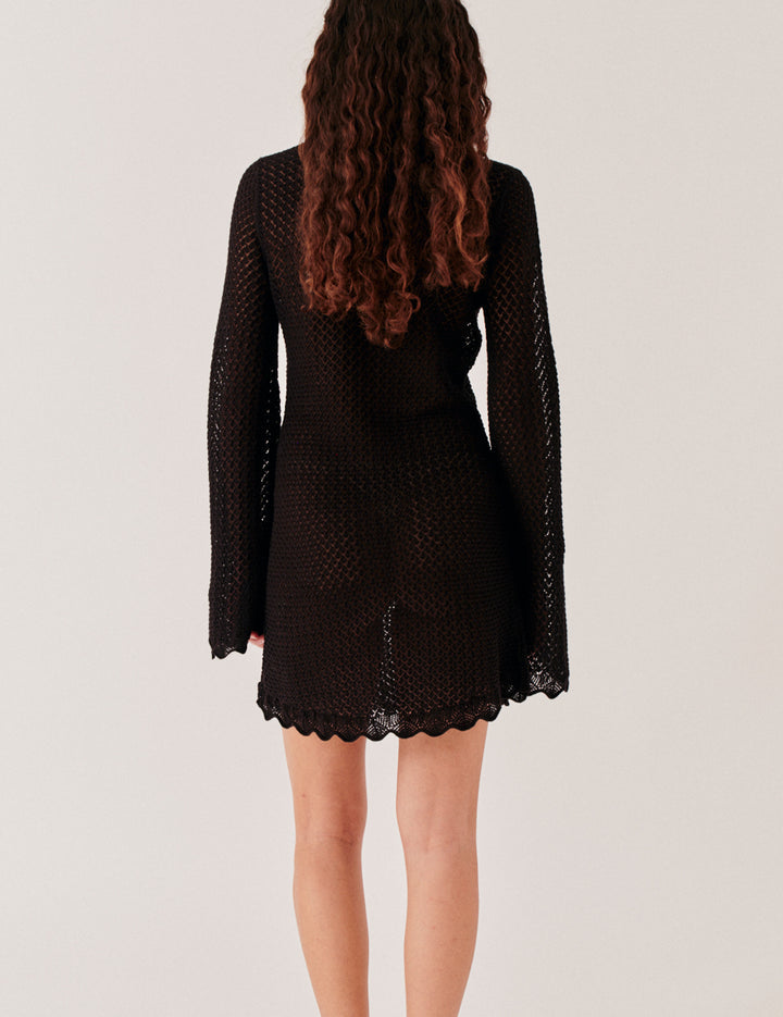 Kjolen er designet med et fint pointelle-strikmønster, som tilfører et elegant og feminint udtryk med små, dekorative huldetaljer, der samtidig giver ekstra ventilation. De friske vidde ærmer understreger kjolens lette og sommerlige look og skaber en harmonisk helhed.