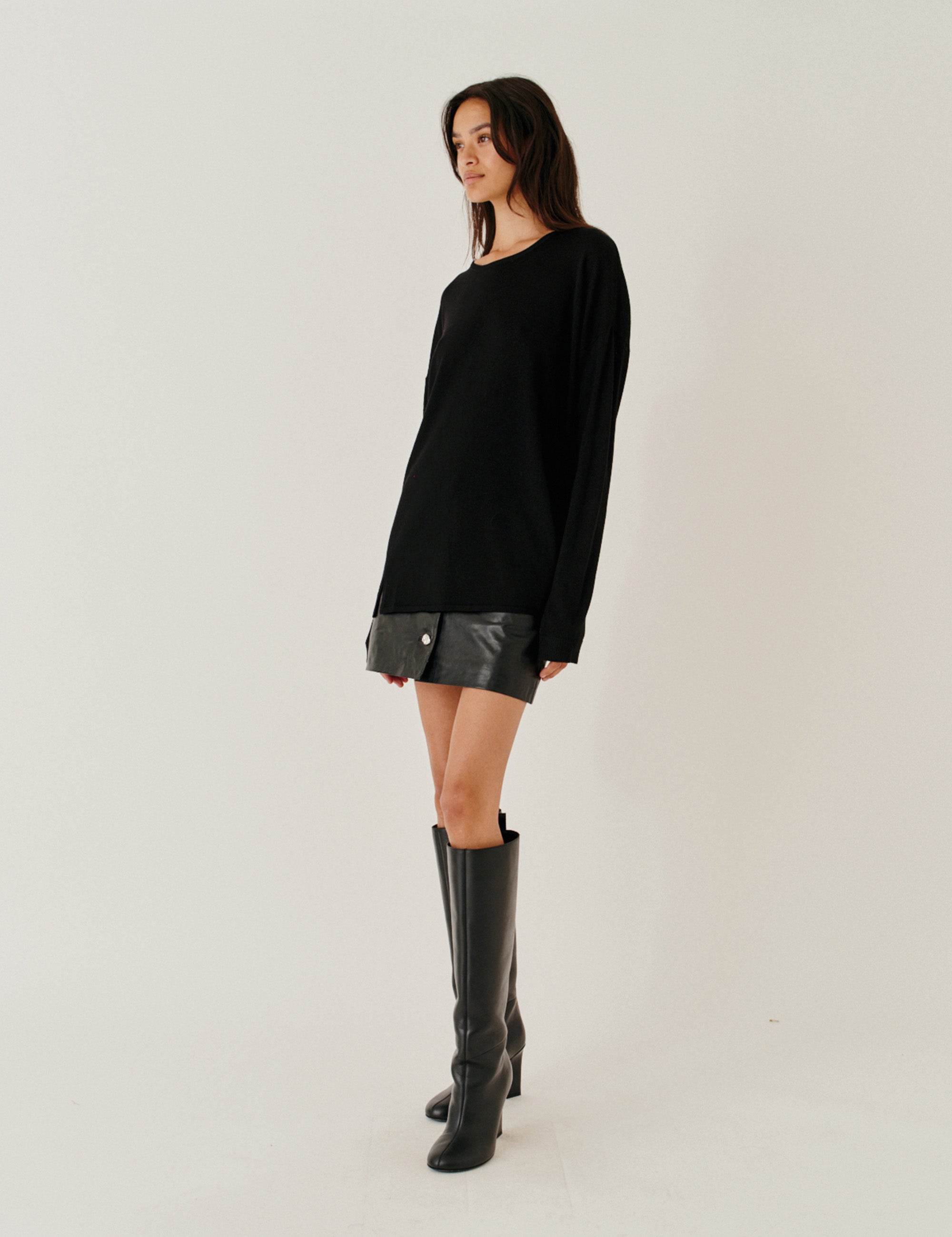 Soho Mini Button Skirt fra The Garment er en sort mininederdel i 100% blødt lammeskind. Nederdelen kan åbnes helt foran og har elegante, funklende sølvknapper, der giver et moderne og luksuriøst udtryk. Den glatte læderfinish og det minimalistiske design gør den til et tidløst statement-piece, perfekt til både hverdags- og aftenlook.